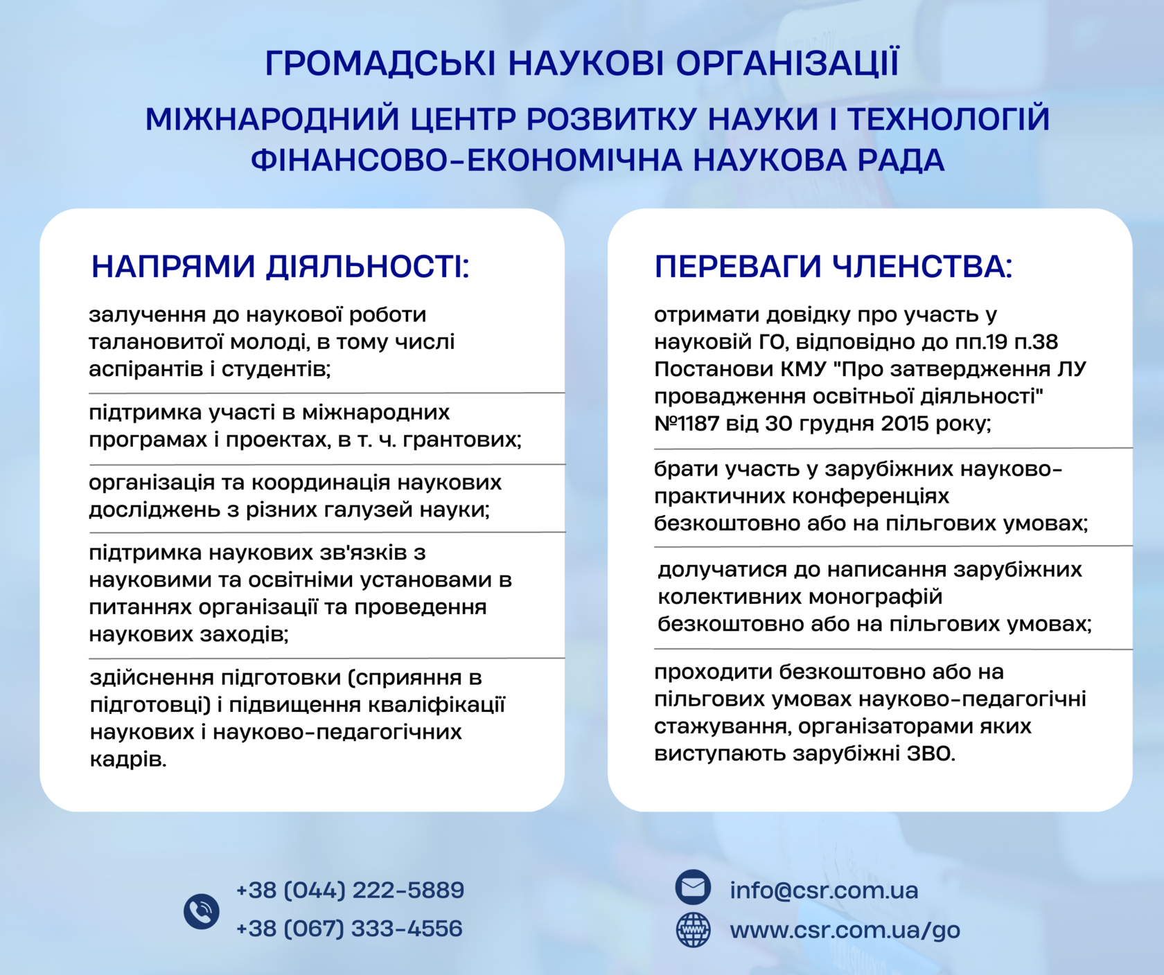 Членство у науковому громадському об'єднанні передбачено пп.19 п.38 Постанови КМУ "Про затвердження ліцензійних умов провадження освітньої діяльності" № 1187 від 30 грудня 2015 року.