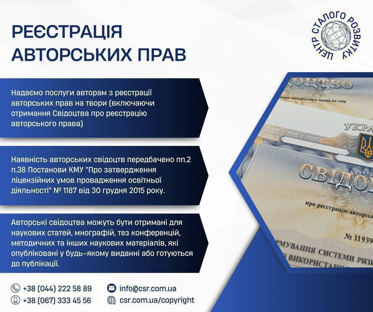 НУ "Центр Сталого Розвитку" надає послуги авторам з реєстрації авторських прав на твір (включаючи отримання Свідоцтва про реєстрацію авторського права).